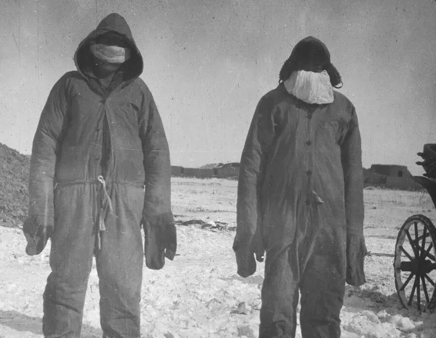 图里这身行头叫防疫棉口罩配连体棉服,厚布面子里塞着棉胎,颜色发暗,腰间一根绳子打个死结,口鼻上系着叠成褶儿的白布,边角被呼气打湿发硬,站在雪野里,风一来,衣摆呼地一抖,脚下嘎吱作响,医生说这口罩是要捂住飞沫,那会儿不讲究牌子,只讲究能顶用。