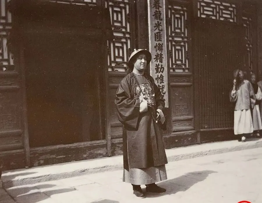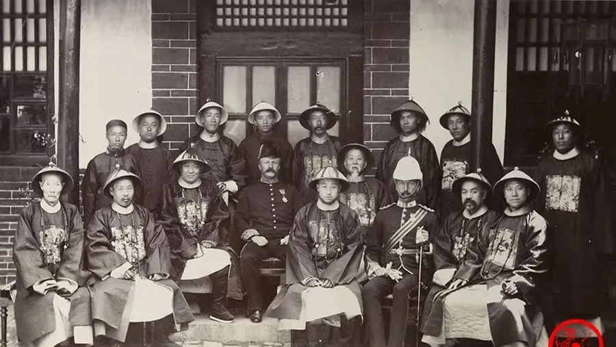 图中这身宽袍大袖叫朝服,绣着补子,胸前挂着念珠,圆顶纱帽压得稳稳的,旁边两位穿窄身军装,钮扣排得笔直,一盔一帽亮得扎眼,这同框就是时代的横切面,以前官场讲的是威仪与礼数,现在看更像中西两套秩序在门槛上对望,袖管一阔一窄,路子也就不一样了。