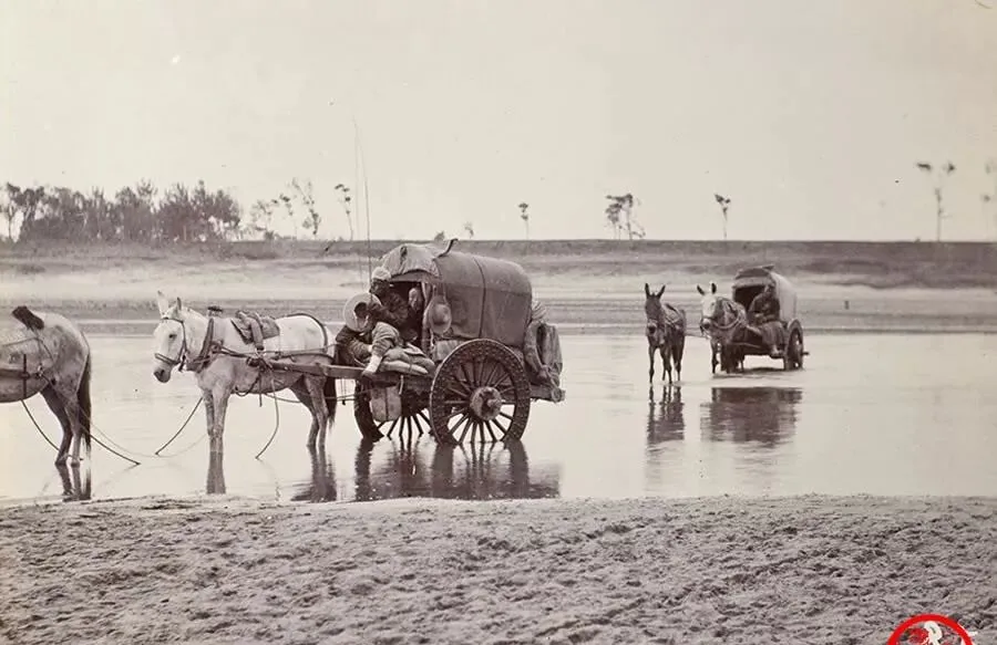 这车叫毡篷车,粗大木轱辘像两只鼓,篷布一搭,货物人都能藏进去,车夫蹲在辕口抻缰绳,马头埋着劲往前探,水面被车辙划出两道亮纹,小时候跟着父亲去集上,看见这种大车就躲远点,车轮碾过来,地面都震一震。