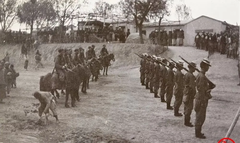 这排人扛的长家伙叫栓动步枪,刺刀明晃晃,靴跟一磕,尘土就冒个泡,口令一落,肩膀齐齐一沉,场边围着半圈看客,袖口里揣着烟锅的人没少,爷爷说以前操练打鼓吹号,现在训练喊口令,听着利落些。