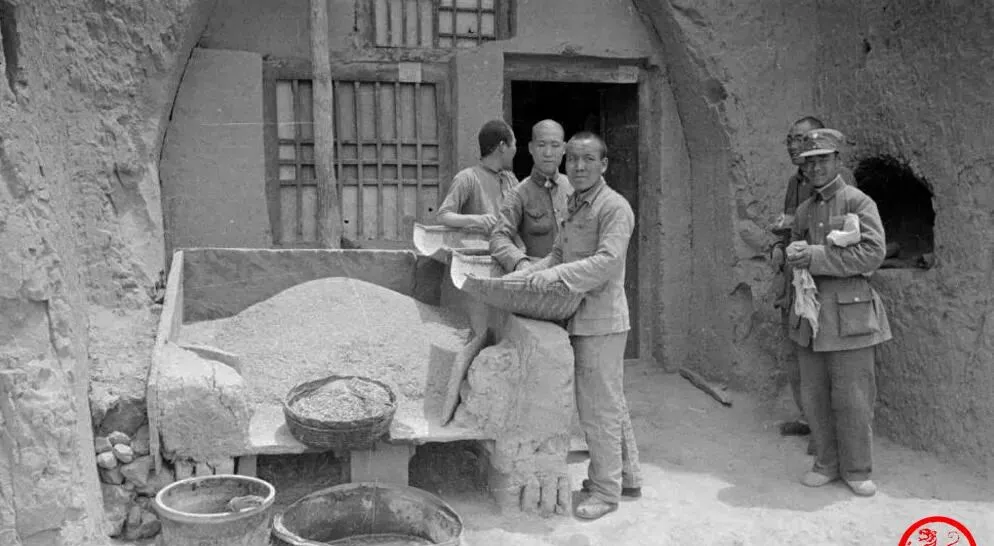 图中这口石砌大槽叫晒粮台,前面一溜簸箕和木桶,土墙门洞口冒着热乎气,士兵把麻袋往上一倒,谷粒哗啦啦流成小山,另外两个人抡着簸箕扬起风,细沙沉下去,粮就干净了,黄土抹墙灰扑扑的,衣裳一会就蒙一层土。奶奶说那会儿粮比金贵,晒一趟看三趟,夜里怕淋了露,门板一放就是挡雨棚,现在仓库烘干一键就行了,当年全靠胳膊和风。