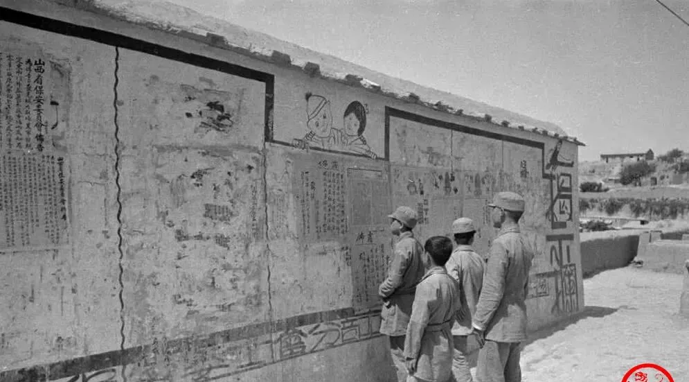 这个长长的墙面叫公告栏,白灰底子上刷着黑框线,大字报、漫画、开会通知糊得满满当当,几个士兵站在日头底下看得认真,指着一角小声念,谁谁谁立功了,明天几点集合,消息全在这堵墙上,别说手机,收音机都稀罕,抬头走一遭就知道镇上发生了啥。
