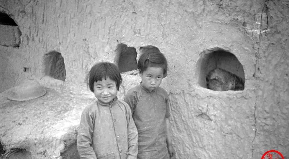 这俩穿打补丁褂子的小家伙,是窑洞外墙上掏的“窑眼”边上拍的,窑眼里塞着锅盖和柴火,笑一个憋一个,脸颊上都是风里吹出来的红疙瘩,土墙龟裂像干旱河床,小时候我在北方老屋也见过这样的墙面,用手一抹,细沙顺着指缝落下去,暖和倒是暖和,风一停就安静得很。