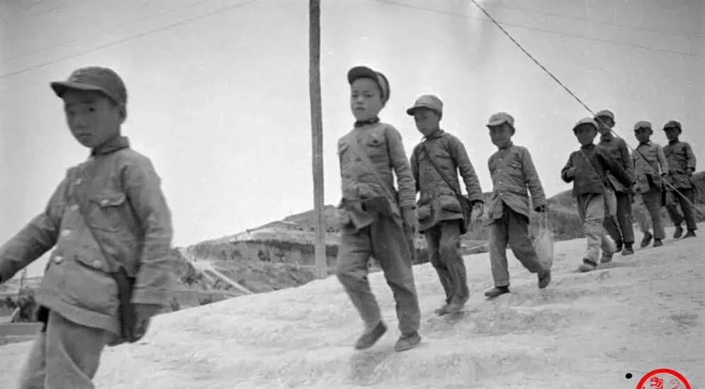 这片空地是学校的小操场,孩子们戴着小帽排成乱又齐的队,墙上一孔孔窑洞当教室,门口钉木格窗,军事化管理四个字摆在那,集合散队一口号,老师手里一根竹杆敲地面,咚咚两声就静下来了,现在的孩子放学背书包,那时放学背柴火也常见。