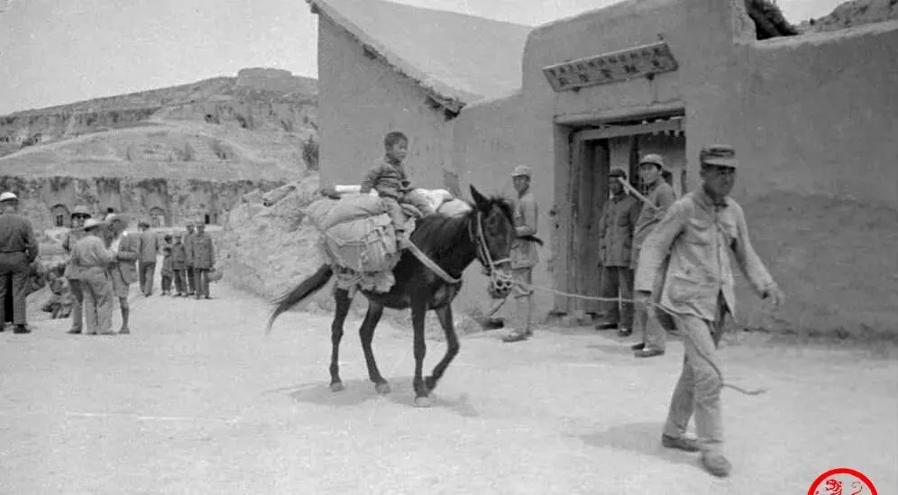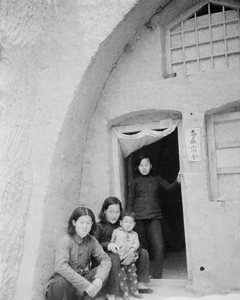 这个土拱门里的几位,是军属和孩子的合影,门旁贴着条幅,写着“肃纪通令”,帘子用白布缝的,风一吹轻轻鼓起来,女人们的衣裳都是自家缝的直门襟,袖口起了毛,表情淡定,日子虽紧巴,一家挤在一孔窑里也能把锅盔烙得喷香。
