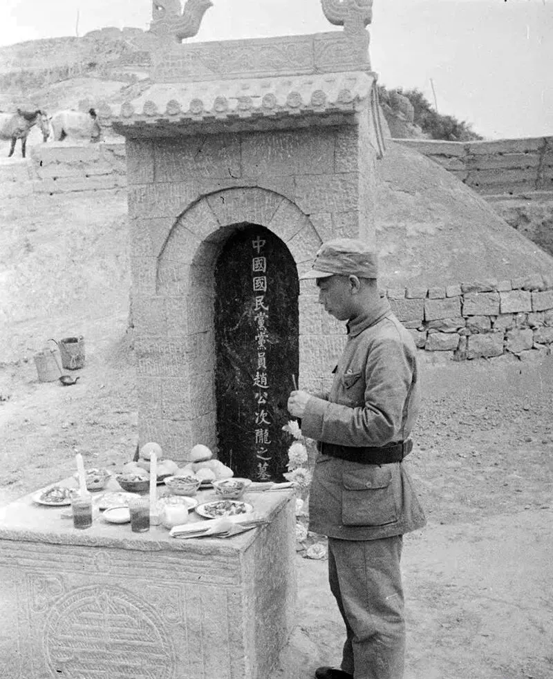 这个石桌子摆满碟子碗盏,馒头两个一对儿,蜡烛一长一短,黑色碑心刻着“赵公次龙之墓”,军人双手合香,背带勒在腰眼上,脚跟并齐,山风从背后绕过来,火苗抖了抖没灭,战时也要讲个情义,忙里偷下脚,给故人磕个头。