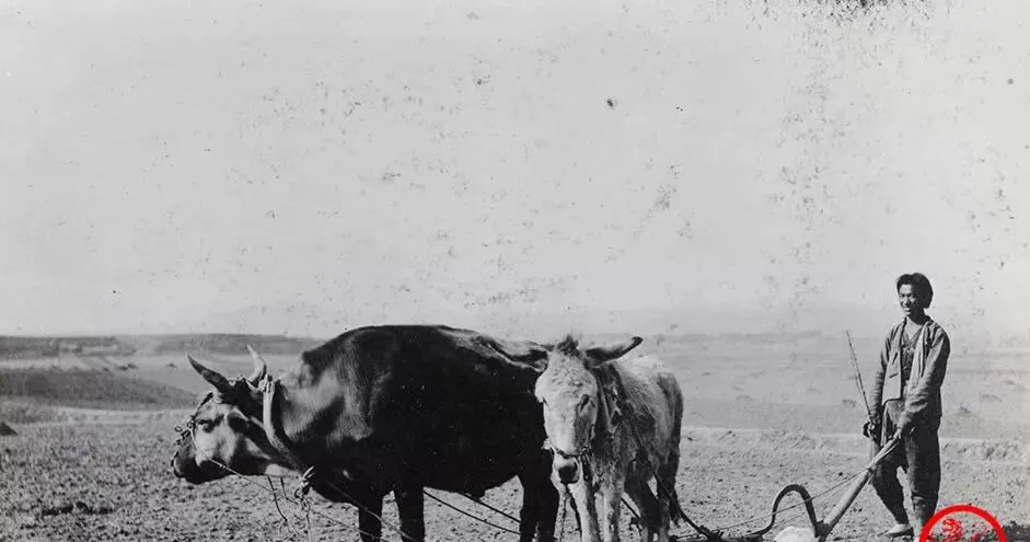 图中的套具叫双辕木犁,牛在左、驴在右,脖颈上勒着粗麻绳,犁铧黑亮黑亮,翻过的地起一道道土浪,男人握着犁把往前跟,脚后跟总被泥巴裹住,春耕就靠这点力气往地里抠,哪有什么机械,风一大尘土扑脸,眨两下眼睛就成泥了。
