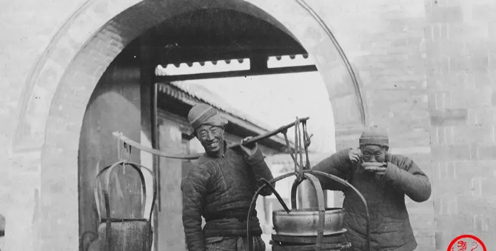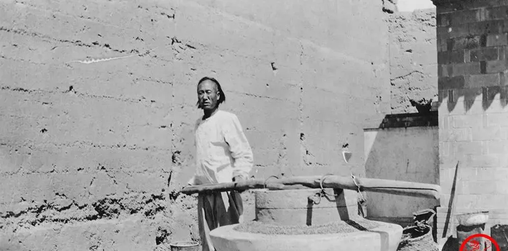 这个组合叫翻边铁桶配榆木担,扁担弯得像月牙,桶沿上翻着一圈铁皮,走起来咣当咣当响,图里这位喝两口解乏的动作太熟了,小时候我跟着父亲去井台,父亲总念叨一句,水要趁凉喝,回到家才好烧茶。