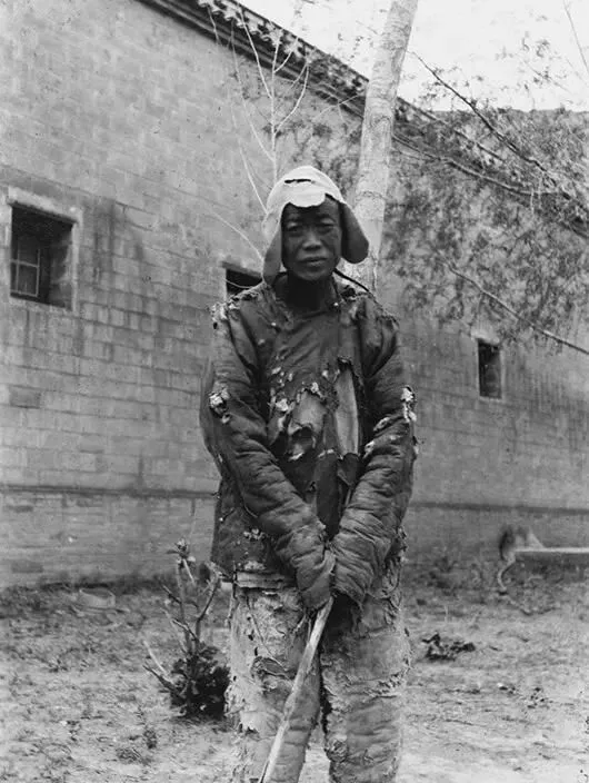 这个样子叫打补丁都补不过来,棉袄上口子叠着口子,帽檐塌着,手里拄根削得光溜的木棍,站在墙边风一吹就抖,我妈看到这张说了一句,以前缝缝补补十几年一件衣服照穿,现在孩子长快了嫌旧就换新的,时代就是这么翻过去的。