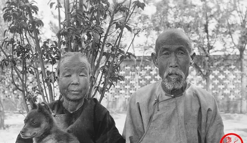 这个温吞的场景叫老伴与小看门,老头儿穿直襟大褂,领口别着一根小别针,老太太怀里抱着只小土狗,耳朵尖尖的,眼睛亮晶晶,后头一排土墙缝着砖花,日子清苦也讲个整洁,家里人常说,狗在就有个响动,门口就不至于太冷清。