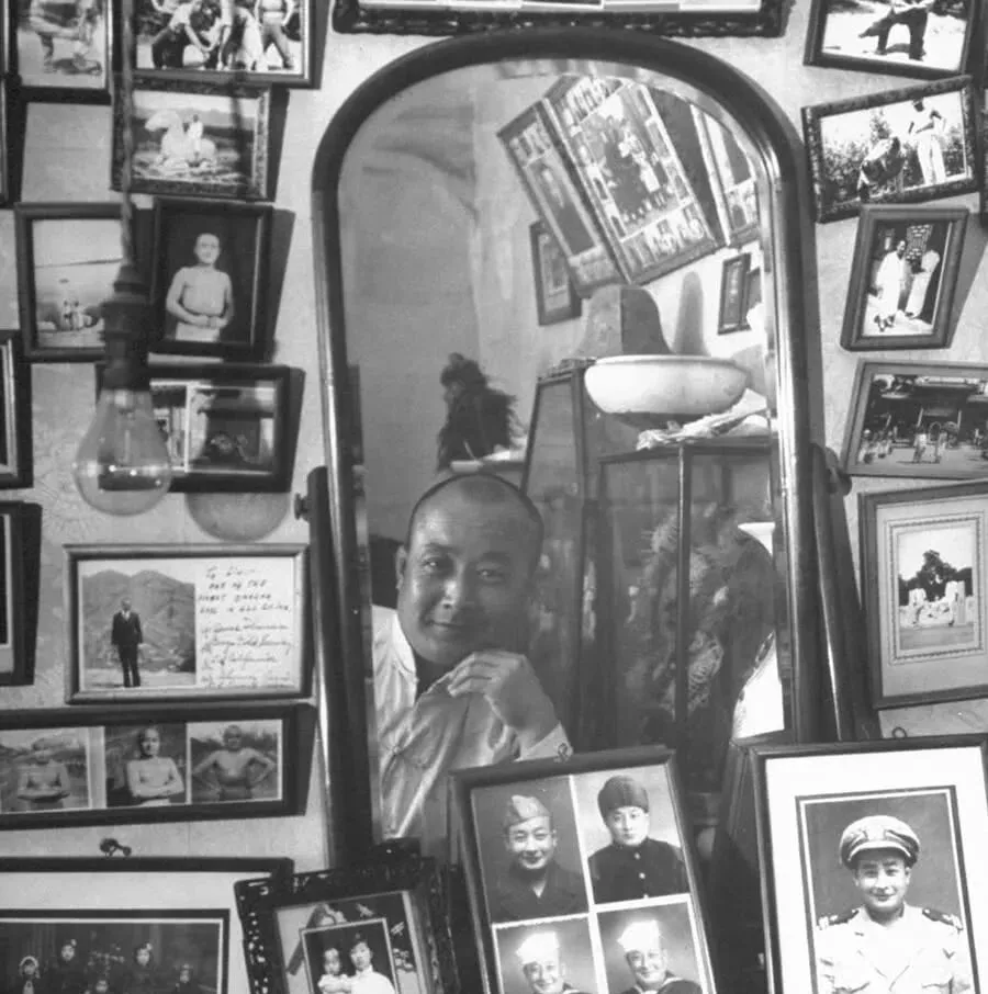 这面老立镜子四周噼里啪啦钉满相框,黑边木框被汗手摸出了油光,灯泡吊在半空,他从镜子里探出半张脸,手托着下巴,旁边摆着旧照片,军装、长衫、童年照都挤在一起,像把前事折成一叠,塞在窄窄的框里。