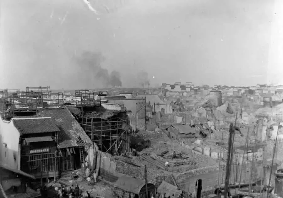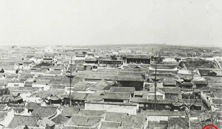 图中这一片瓦浪叫屋海,密密匝匝的青瓦灰墙像鱼鳞一样铺到天边,木桅杆和电线杆扎在屋脊间,远处露出几幢带西式窗的楼,都是租界里的新式房子,这么看城好像很小,可巷子一钻就深了,转两个弯就能迷路,那时候人多事杂,挑担卖货的、摇铃卖汤圆的,一拐弯就撞见熟人,打声招呼就算过了半天。