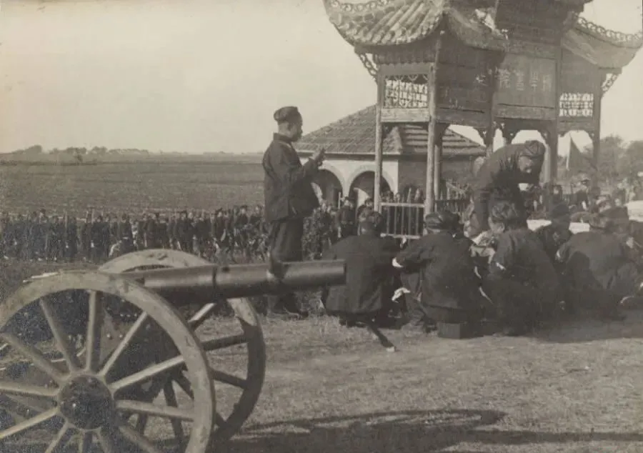 这个阵仗叫操练间隙开饭,草地上圆滚滚的木轮炮停在一旁,士兵围着锅灶蹲一圈,军帽压得低低的,碗里冒着热气,学堂牌楼后就是练兵场,老师傅说打仗不怕跑得远,就怕饭点赶不上,凉了硬了都能咽,饿着才真难受。