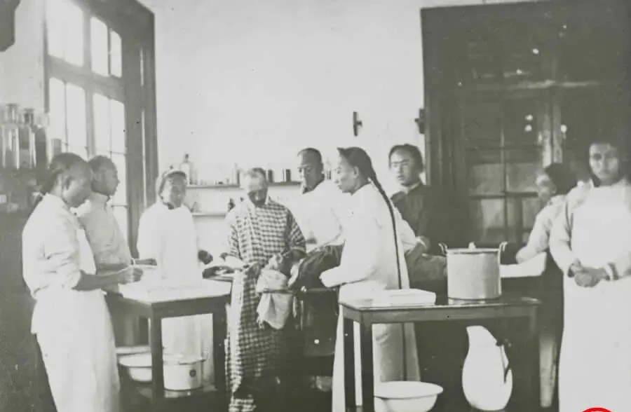 图中这间屋子叫手术室,长窗透进白光,木桌上摆着剪刀纱布和搪瓷壶,穿白围裙的先生正俯下身打结,旁边几个留着辫子的年轻人递器械,手一抖都不行,叔公说他当年去看过一回,人家把窗开得大大的,酒精味冲得人直眨眼,病人醒来先摸摸胸口,能喘一口顺气就谢天谢地。