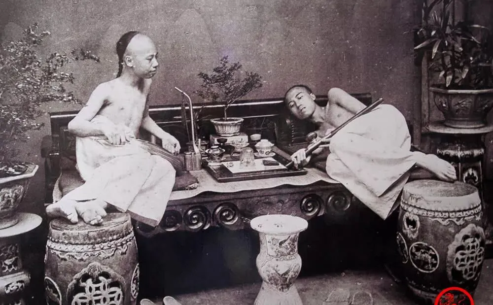 这几件细长的是烟枪,铜嘴透着油亮,木榻雕着回纹,托盘里摆火镰火石,两个年轻人一个半躺一个盘坐,指尖夹着细器皿,桌上还有小壶小碟,空气像蒙了层灰,妈妈指着相片说,看着讲究,骨头里是空的,那叫耗命的体面。