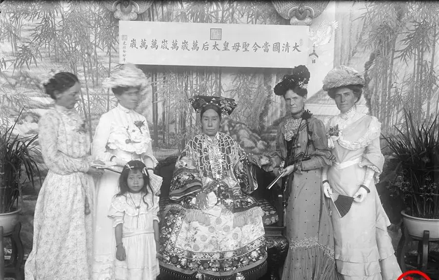 图中这场面叫接见,中间端坐的是太后,身上是绣金龙的朝衣,胸前一片团寿纹,头上那顶点翠钿子沉得很,坠着流苏一晃一晃的,旁边几位穿长裙戴宽檐帽的女士,是被请入园子的外国公使夫人,她们手里捏扇子拿手套,神情拘谨又好奇,这一幕像是把两个世界硬生生并在了一张底片上。