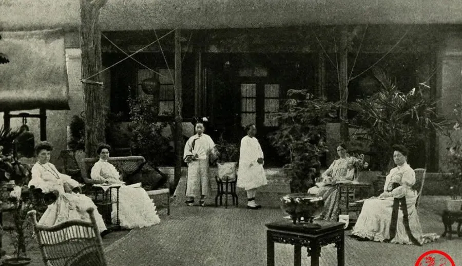 这处摆设和前面那张不同,茶几矮,靠背椅高,旁边的花几上放着铜盆景,光影从廊下斜斜打下来,几位太太把裙摆顺好,姿势松弛些了,聊天的样子就自然了,过去的洋务气就是这样,一半是新鲜,一半还得照旧。