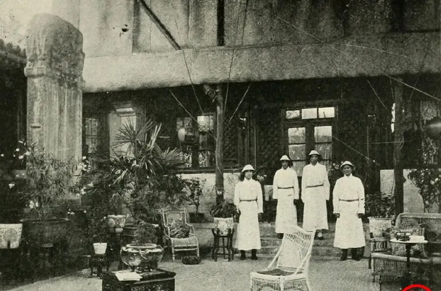 这个院子叫西式茶座,藤椅一溜摆开,几只大号景德镇鱼缸做点景,侍从在旁边站着等候,茶碗是盖碗,热气直往上冒,老照片没有声音,我却总能听见瓷盖轻轻一碰那一下脆响,过去会客重礼数,聊了半天也就各自收好手绢起身告辞,现在我们约杯咖啡,十分钟就能交代完。