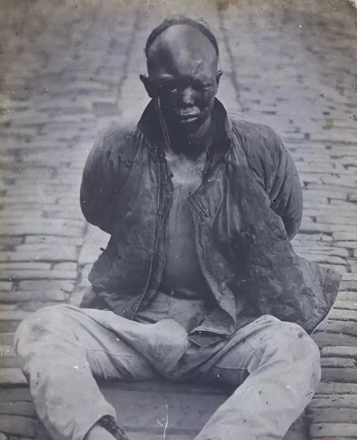 图中这位的双手反绑,脸被烟火糊得乌黑,破棉袄敞着口,砖路一块块在身下发凉,眼神是倔的,也是疲的,奶奶以前常说,最怕看到“坐地的人”,因为站着的还能跑,坐地的多半已经跑不动了。