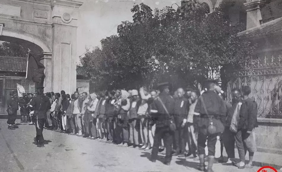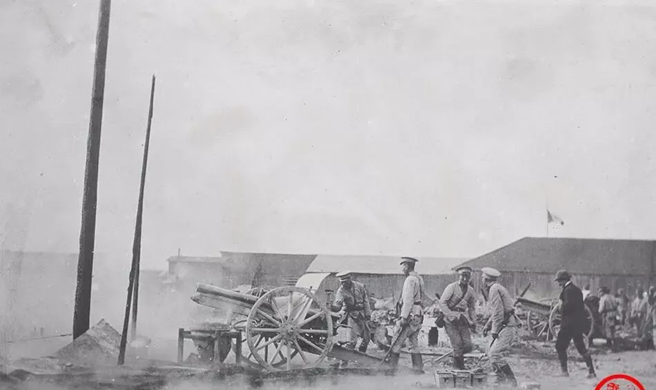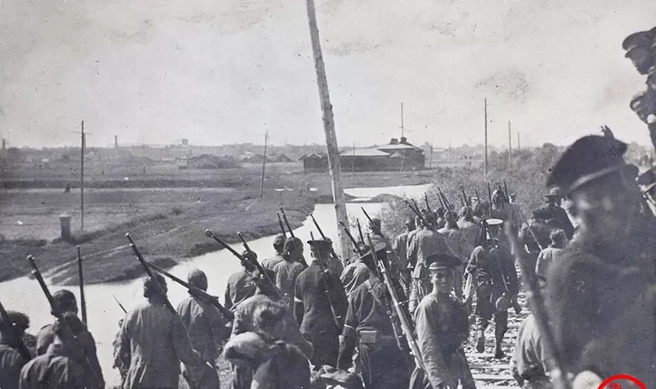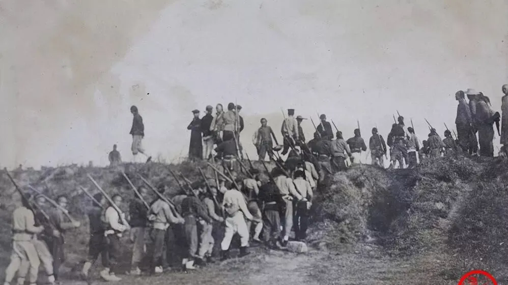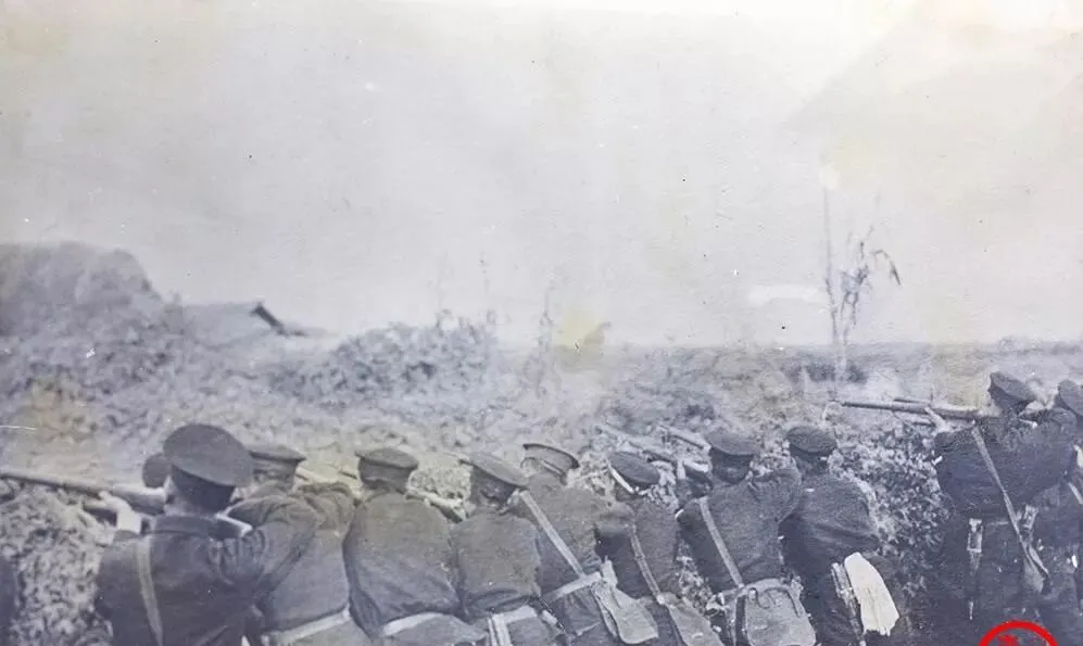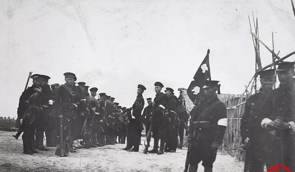 这个队列就是新军的射击线,帽沿压得低,肩上扛的是长枪,扳机一扣,泥土会跳起来,旁边有人把白布条扎在臂上,那是彼此认的号,小时候在电影里见过类似镜头,可这张是真人真事,枪口冒的烟都能数清。