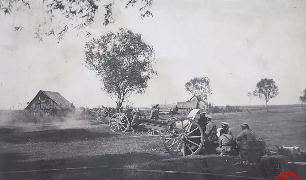 图中这门轮子高过膝盖的炮,叫野战炮,木辐条一圈圈,炮栓明亮,士兵把炮尾抬起来挪几步,箱子里码着炮弹,指挥的人一手扶鞭一手比画着角度,爷爷说打炮最怕风向错,烟退不快,下一发就要憋着气上。