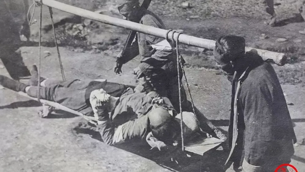 这个竹竿担架就是临时扎的,两端系麻绳,中间铺一块门板,伤员面朝天,手还在捂着腹部,抬的人脚步不齐,一深一浅,医生呢,多半在前面忙不过来,妈妈说,看见担架别问多不多,“有一个就已经是多了”。