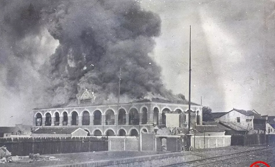 这幢拱廊建筑起火了,黑烟直冲云顶,钟楼指针还在那儿,铁轨从前面穿过,火在屋脊上跳,像一条红线将城分成了曾经与此刻,以前出门坐火车是喜事,现在看见车站只觉得发烫。
