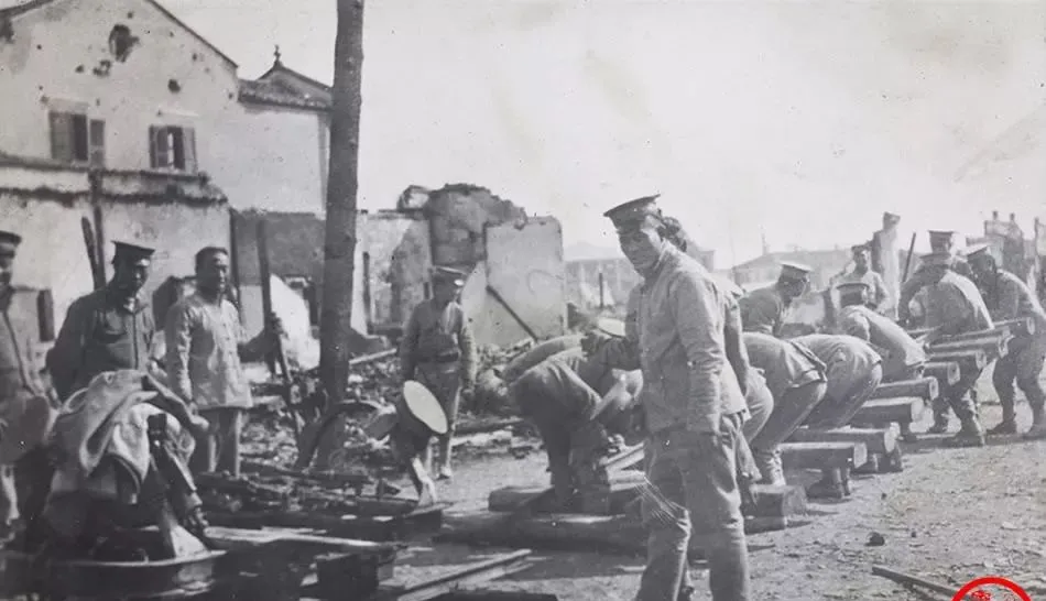 图中这些人蹲着弯腰,双手抬着铁轨,身后是被烧过的房子,工具散一地,领头的回头喊了一句,声音没拍进去,但嘴形能读出来,“快点”,战火里修路是为了谁,答案不必写,照片已经说了。