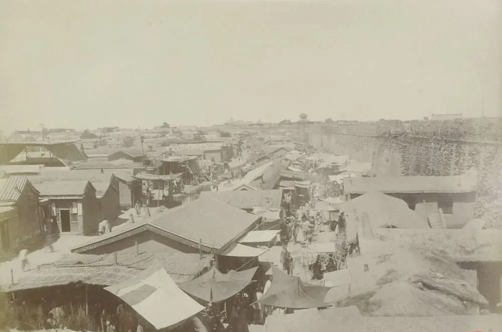 这片屋面起伏的叫棚瓦灰脊,顺着街巷望去,檐口压得低低的,帘子遮出阴影,正中搭着凉棚,像条白绸子在屋顶里穿,小时候我第一次上高处看集市,就是这眼神儿,太阳直晒,下面人挤成一股流,吆喝声被瓦片反着弹上来,热闹却不乱。