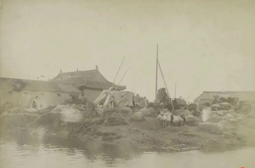 晚清老照片:河面停泊挂帅旗官船,男子蹲在墙根拉粑粑。