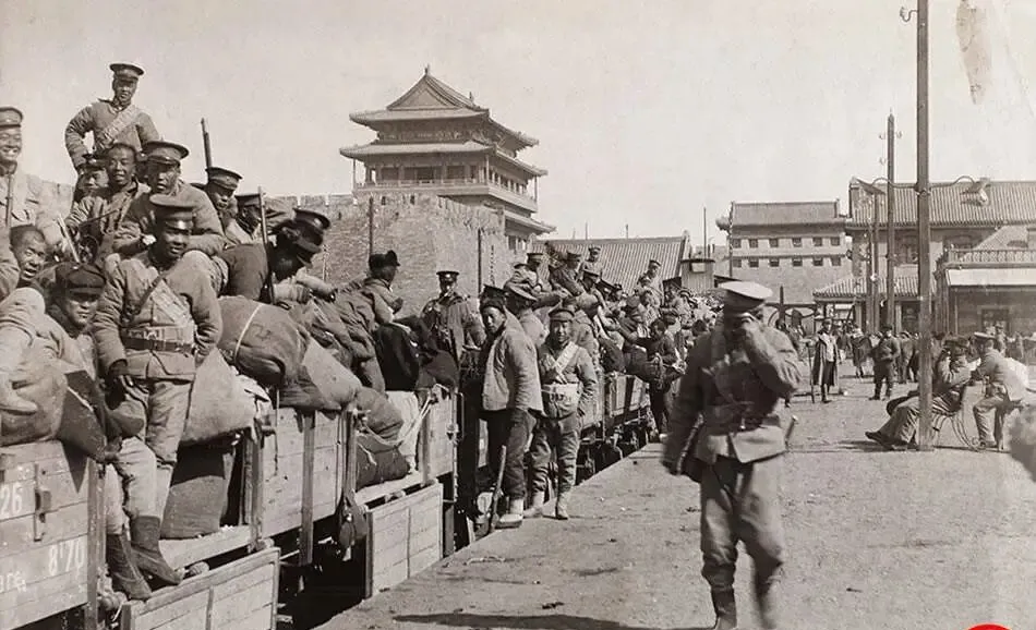 图中这一溜木制敞车皮挤得满满当当,皮带包袱叠成小山,士兵的呢帽斜着扣在额头上,胸前皮带交叉,步枪插在两膝之间,前门箭楼就在后头杵着,像个不说话的见证人,火车头一吼,车皮抖三抖,人喊马嘶都被压在铁轨的轰鸣下去了,爷爷说那会儿当兵有两种打扮,一种西式呢帽皮带,一种还是土布棉袄裹腿子,混搭得很,旧朝气数已尽,新法还没成型,就这股乱味道。