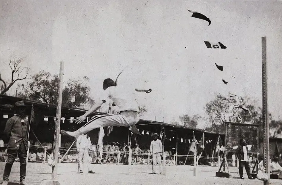 这个小伙子正翻越横杆,辫梢子像钩子一样在空中划弧,白衫细腰带,脚下布鞋抻得直,裁判穿着呢制服站在一旁抬下巴看,他要是再矮半指,辫子就先犯规了,学校操场边上挂着小旗子,呼啦啦一串,小时候我在操场跑圈,老爹指着墙上的体育老画说,那会儿练体操先把辫子盘紧再上器械,不然真妨事。