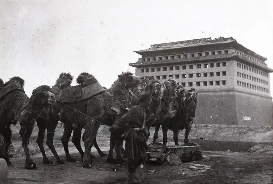 这个角楼像个大笼子,眼孔一格一格,下面的石槽里水不多,驼夫拽着缰,踮脚往里看,骆驼弯着脖子嘬水,鼻孔一张一合,喝到兴起会咕噜一声,溅到胡子上就是一串小冰凌,城内外的盐面、皮毛、干果都靠它们驮着过门洞,以前一列骆队像慢吞吞的火车,现在货车一脚就飞出城了。