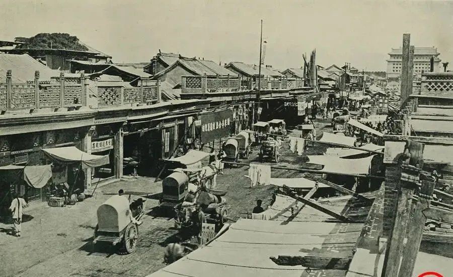 图中这条热闹的街叫前门大街,檐下牌匾一溜排开,黑底金字直晃眼,牛车骆驼车挤在一起慢悠悠地过,路边棚布挑出一片阴影,卖茶汤的吆喝一句就飘出去老远,我姥爷说那会儿进了这条街,“吃喝玩乐都有着落”,旗门里头规矩多,这里可真是另一番天地。