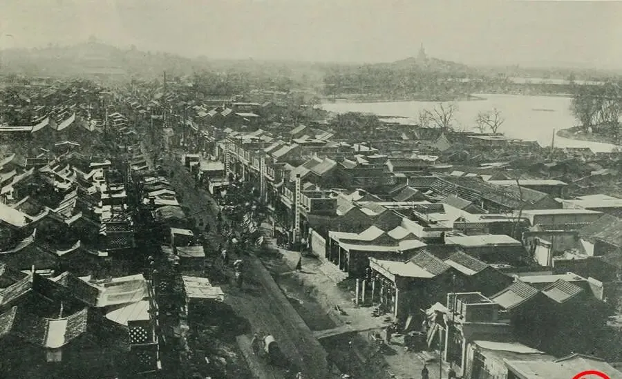 这个高处俯拍的是后门大街,也叫地安门大街,左一排屋脊一直伸到水边,远远能瞧见白塔的影子,铺子门脸没前门阔气,买卖却一点不含糊,绸缎店金银号挤在一块儿,奶奶笑我认路不行,说只要闻见湖水潮腥味儿,往里走就是这条街。