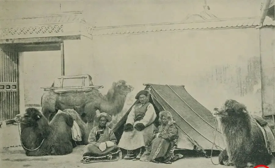 这个小帐篷旁边蹲着的几位是来京做买卖的蒙古商人,厚呢袍子裹得严严实实,身后几峰毛色发亮的双峰驼慢吞吞地嚼草,驼鞍上还压着木箱和皮口袋,他们不住店,找块墙根支起篷就过夜,爷爷说人家图个利落,白天卖皮货毡毯,回程再把茶叶瓷器捎回草原。
