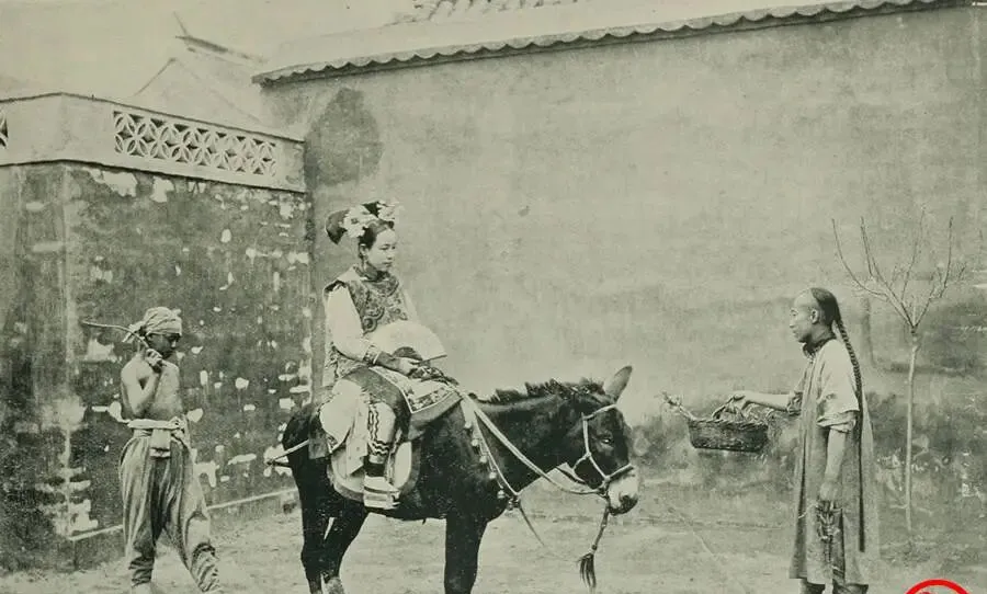 图中这位打扮精致的妇人正骑着黑驴出门,小厮提着马鞭跟在后头,前面的小贩举着竹篮递过去,估摸是叫卖瓜果点心,她脚边的镶边靴子一晃一晃,缨穗贴着鞍角打圈,那时候女子出行坐轿骑驴都不稀奇,现在你要这么上街,准得被人拿手机追着拍。