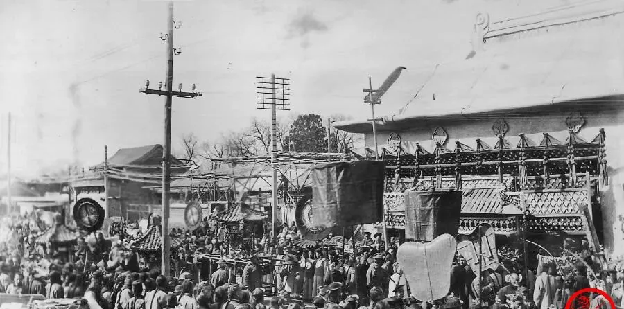 这张又把电线杆和送殡队装在一块儿,前排的大鼓皮面鼓包得圆,绸伞像一朵墨云,台檐下有人支着下巴看,旁边卖糖葫芦的小贩把担子往旁一搁,红果在冬日里亮晶晶的,我小时候去庙会,最爱听的不是锣鼓,是人群里碎碎的说话声,像河水拐弯,带着热乎气。