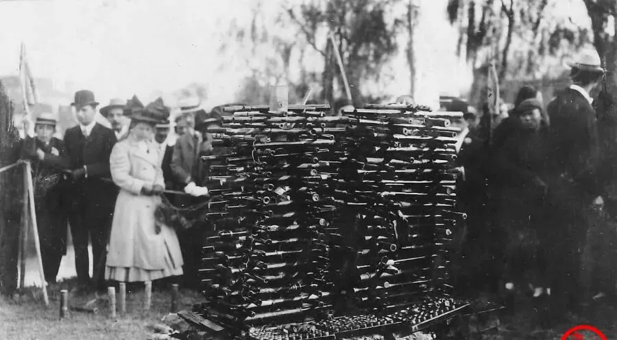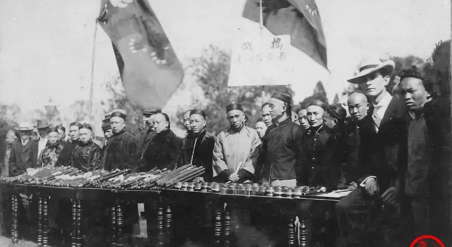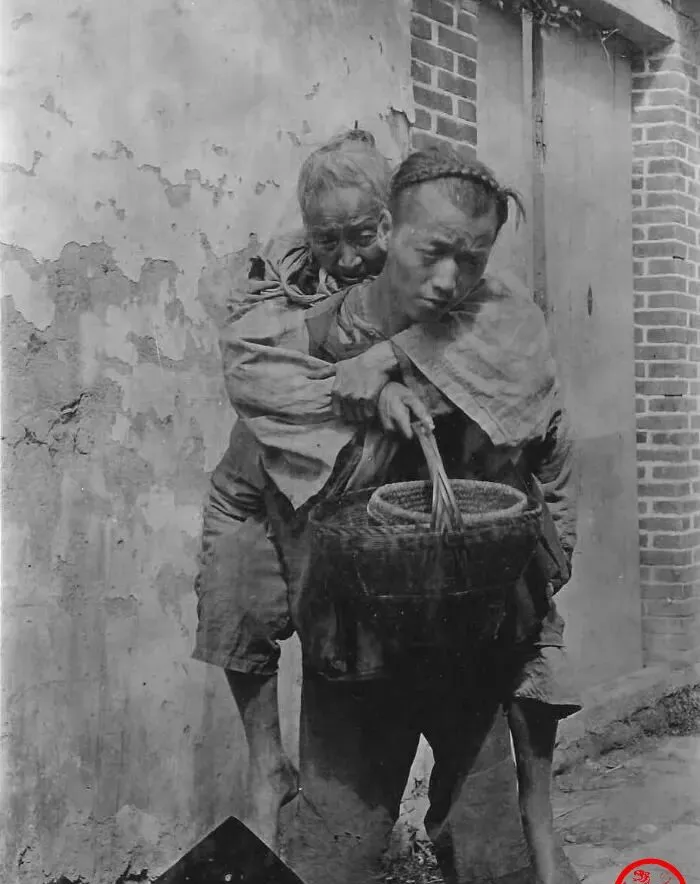 晚清老照片:1908年上海销毁鸦片和烟枪,年轻人背着老母亲乞讨。