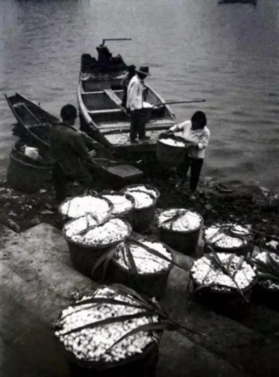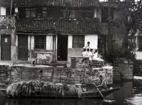 1991年7月,塘栖翠紫湖,船只从河面划过,人们在河边乘凉,这是水乡古镇特有的场景。