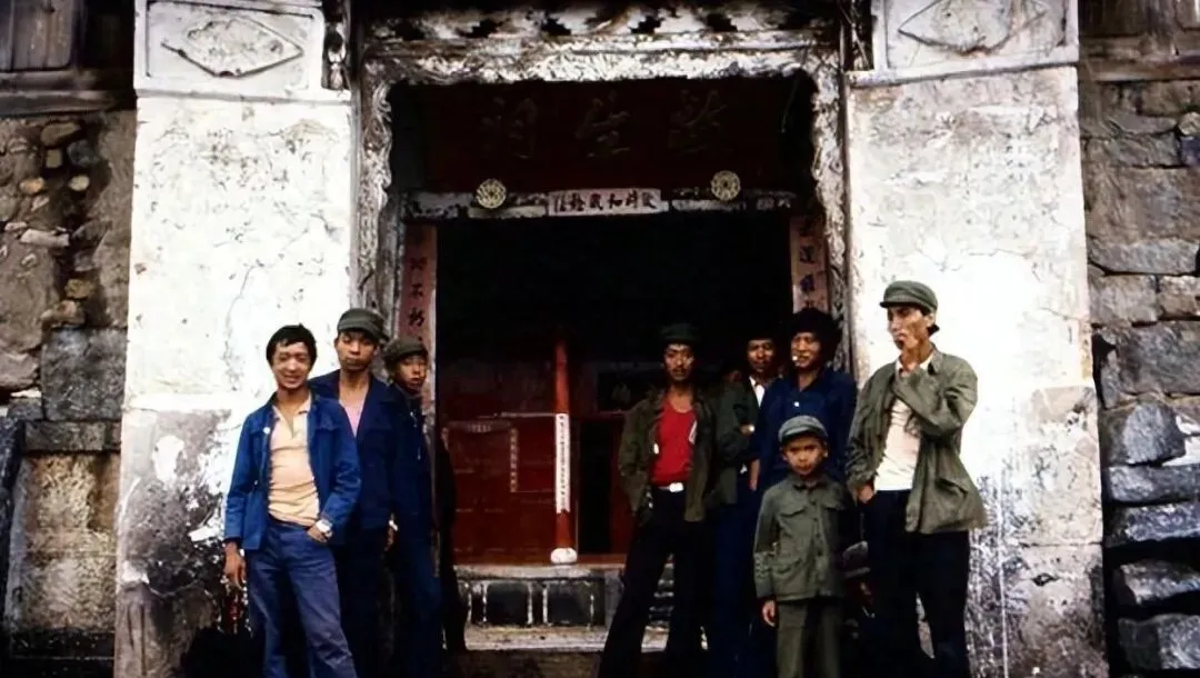 这群站在门槛上的小伙穿的是蓝布中山装和绿军装,腰间皮带扣咔哒响,袖口磨得泛白,笑容里有点腼腆,站在门洞阴影下像是要去开会,又像是下了工地来歇口气。
