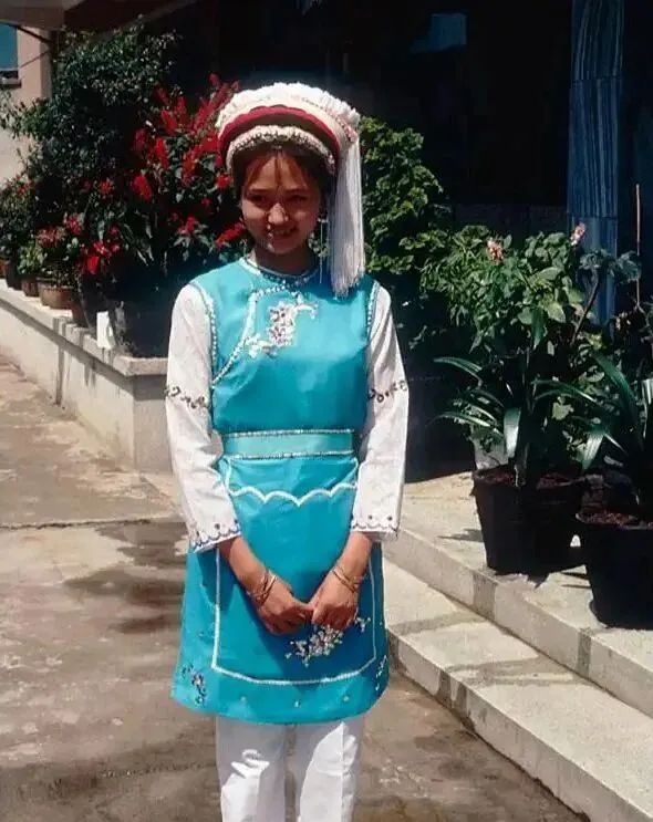 图中这身浅蓝坎肩叫白族女装,上面细细绣着小花,腰间一圈亮线,头顶是红白环形帽帏,姑娘笑得拘谨,手指扣在一起,阳光一照,衣摆边沿的珠片一闪一闪的。