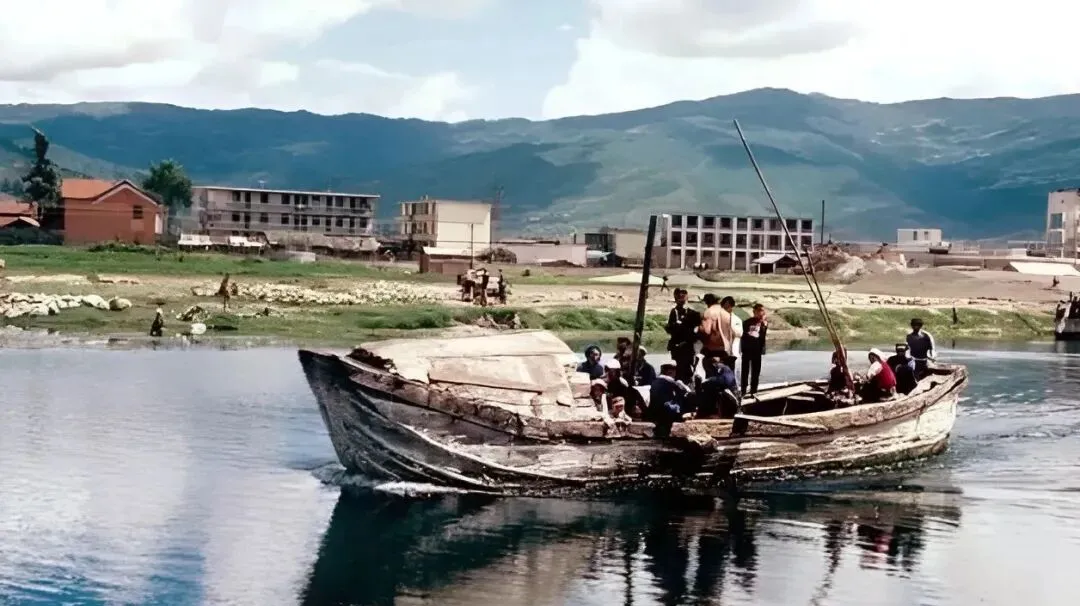 这条鼓着肚子的木船就是洱海的客渡,船帮上裂漆痕清清楚楚,船艄立着一根竹篙,岸上连着刚起的楼房,船舱里坐满人,竹篮挤着包袱,船尾浪花扯成一条白线,靠村口那边多是低矮的瓦房和晾晒的渔网,以前过海靠桨和风,现在环海有高速和电车。