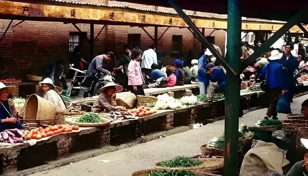 这排写着标语的棚子是黑龙桥菜市场,条桌上摊着青椒白萝卜和番茄,扁担一放就成摊,戴草帽的婆婆坐在篓边打盹,旁边小孩拿豆角当跳绳玩,那会儿的菜多是自家地里现摘。