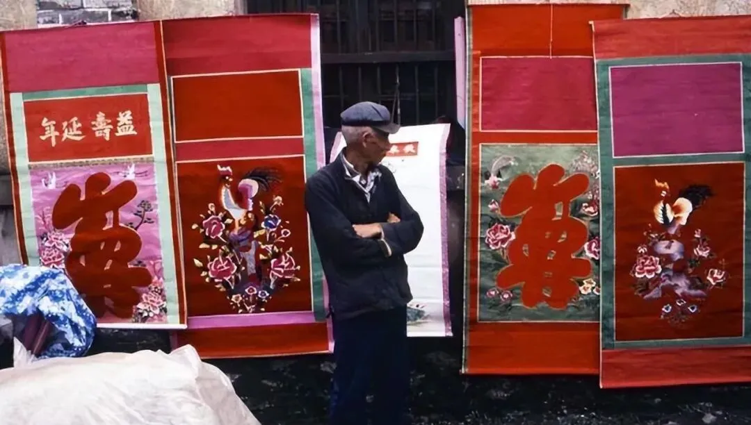 这几幅红得发亮的叫门画,绸缎底衬,烫金大字贴在中间,卖画的老先生手插袖里站着,遇上人问价就慢慢掀开给你看细活,过年把它往门上一贴,整院子都喜庆。