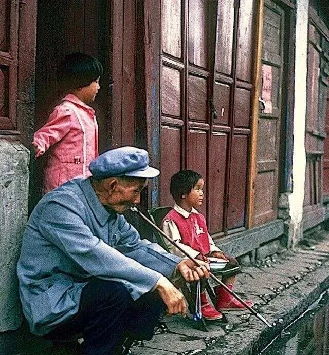 这根细长的铜杆叫烟袋,老人蹲在门槛边抽两口,旁边的小孩抱着碗看热闹,巷子里有人吆喝卖豆腐,声音从远处传过来,一会儿就淡了。