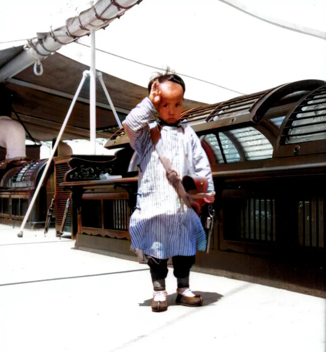 那时候甲板是热的,阳光一落就反白,孩子站在当中,影子短短一块,旁边的船篷绳子拉得紧,铁撑子直挺挺插在甲板上,风吹过来,篷布哗啦啦响,像给他的敬礼配了节拍,谁说孩子不懂礼数,这一下举得可到位了。