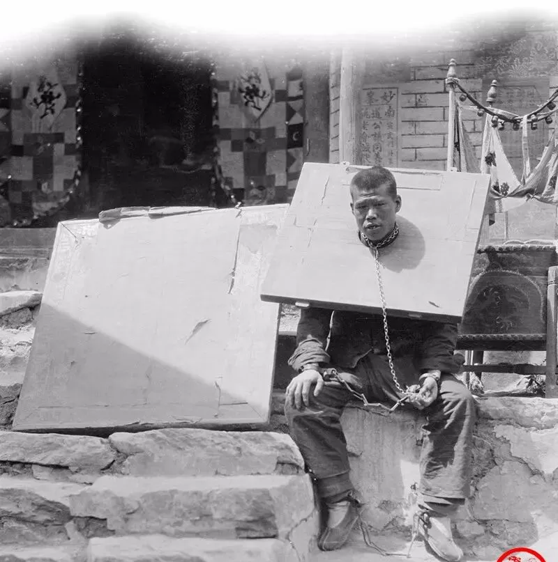 这个画面里同样是枷,木面上裂缝处用纸绳缠过,脖子上铁锁连脚镣,人在石阶边半坐半倚,眼神直直的,风一吹木板晃两下,链子“哗啦”响一声,旁边那块备用的大枷像块冷脸,告诉你那时候法子多半靠威吓。