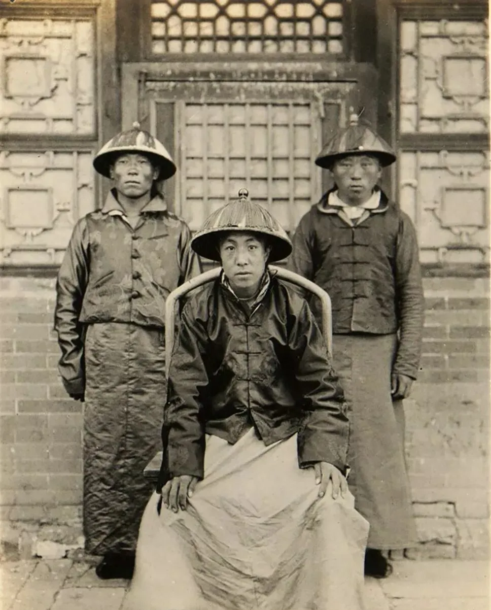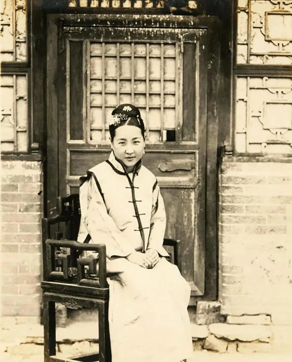 这位坐在方扶手椅上,发髻高束,发饰挤着光,窄襟大襟都沿着黑滚边,袖口直直垂下,整个人像一盏灯立在门框前,前清样式还留在身上,朝代过了,习气还在,那时候的人认衣不认人,一身行头走出去,就先替你说话了。
