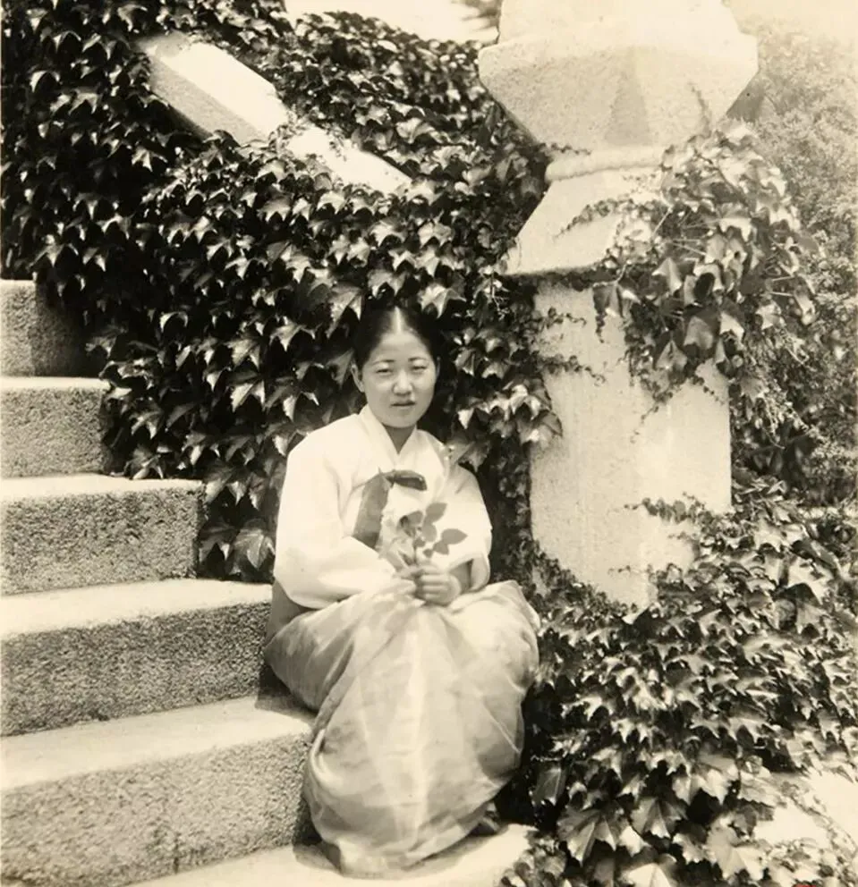 这个女孩穿的是韩式长裙与短上衣,袖子阔阔的,坐在爬满常春藤的台阶旁,手里捏着一枝叶子,光影打在脸上很柔,战事离她也许不远,可这么一坐就把清宁留住了两秒,放到现在,谁还穿这么讲规矩的衣裳,上个楼就嫌不方便呢。